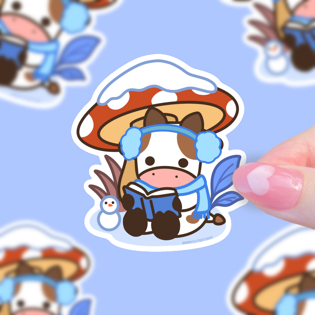 Winter Cow Reading Under Mushroom Vinyl Sticker